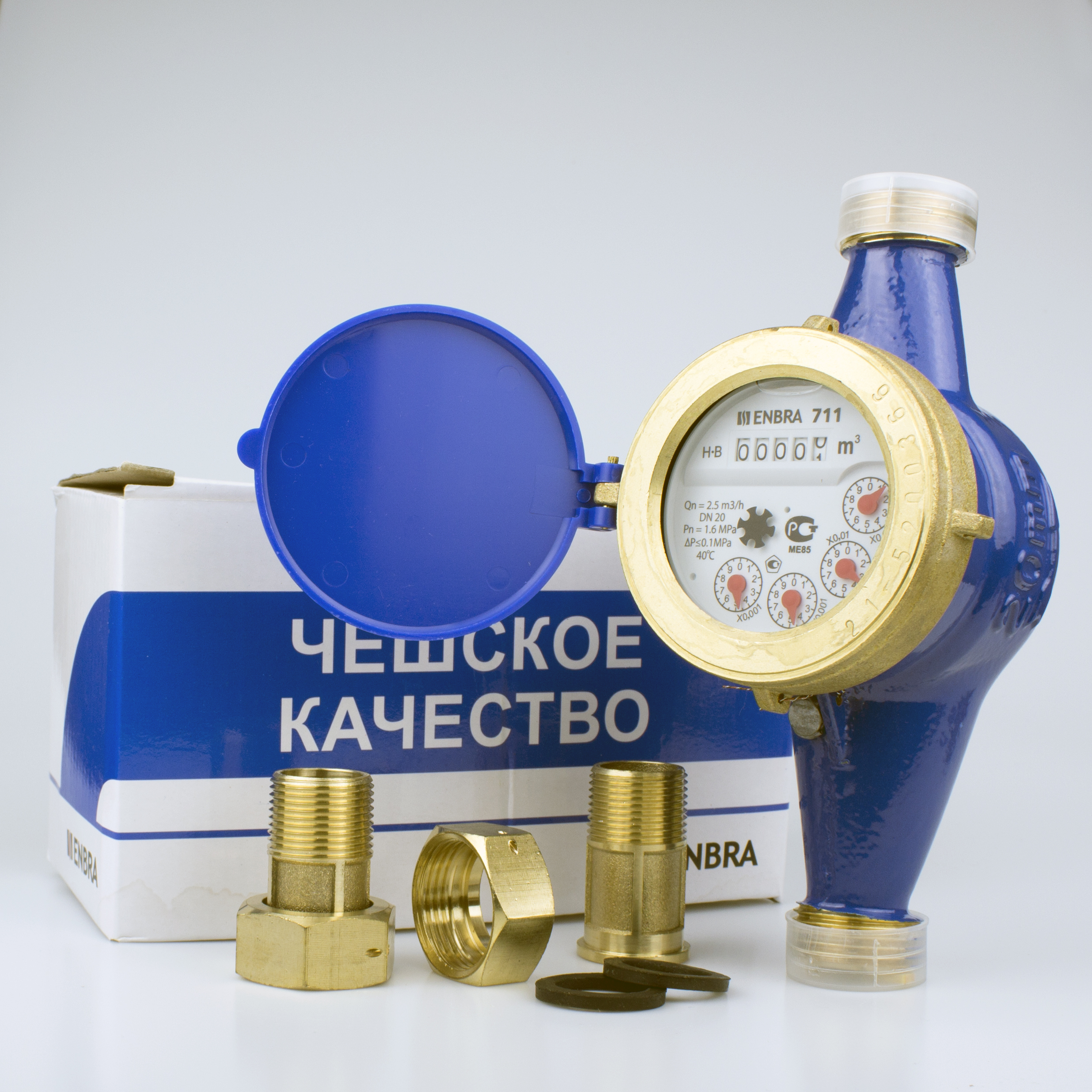Комплект из счетчика воды ENBRA-711 и монтажными частями, состоящими из двух резьбовых штуцеров - один выход с внутренней резьбой "G 1" и один выход с наружной резьбой "G 3/4", двух гаек и двух прокладок.