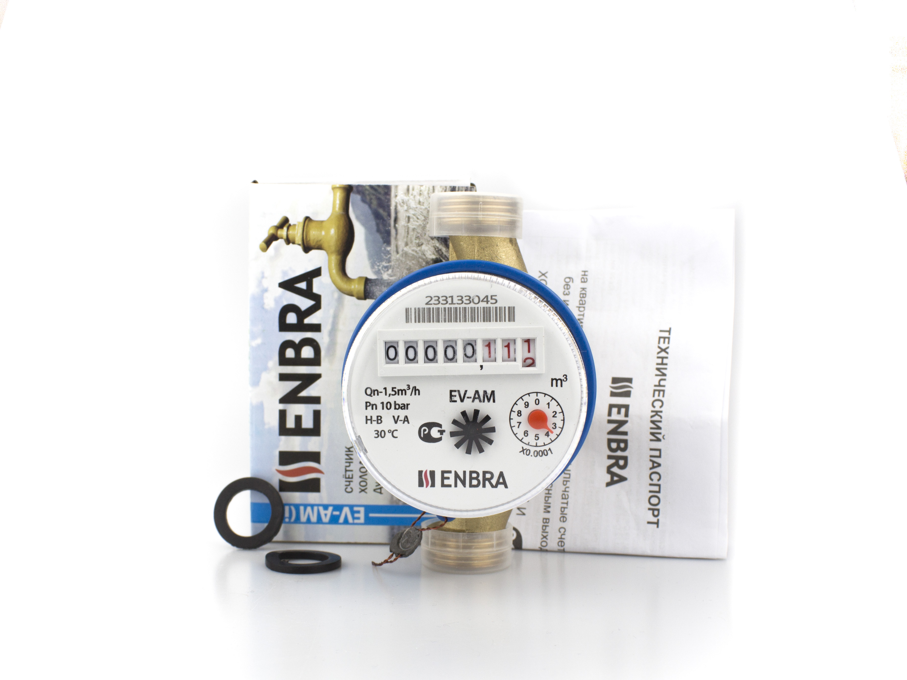 Комплект из счетчика воды Enbra EV-AM 110мм ХВС и монтажными частями, состоящими из двух резьбовых штуцеров - один выход с внутренней резьбой 3/4" (20 мм) и один выход с наружной резьбой 1/2" (15 мм), двух гаек и двух прокладок.