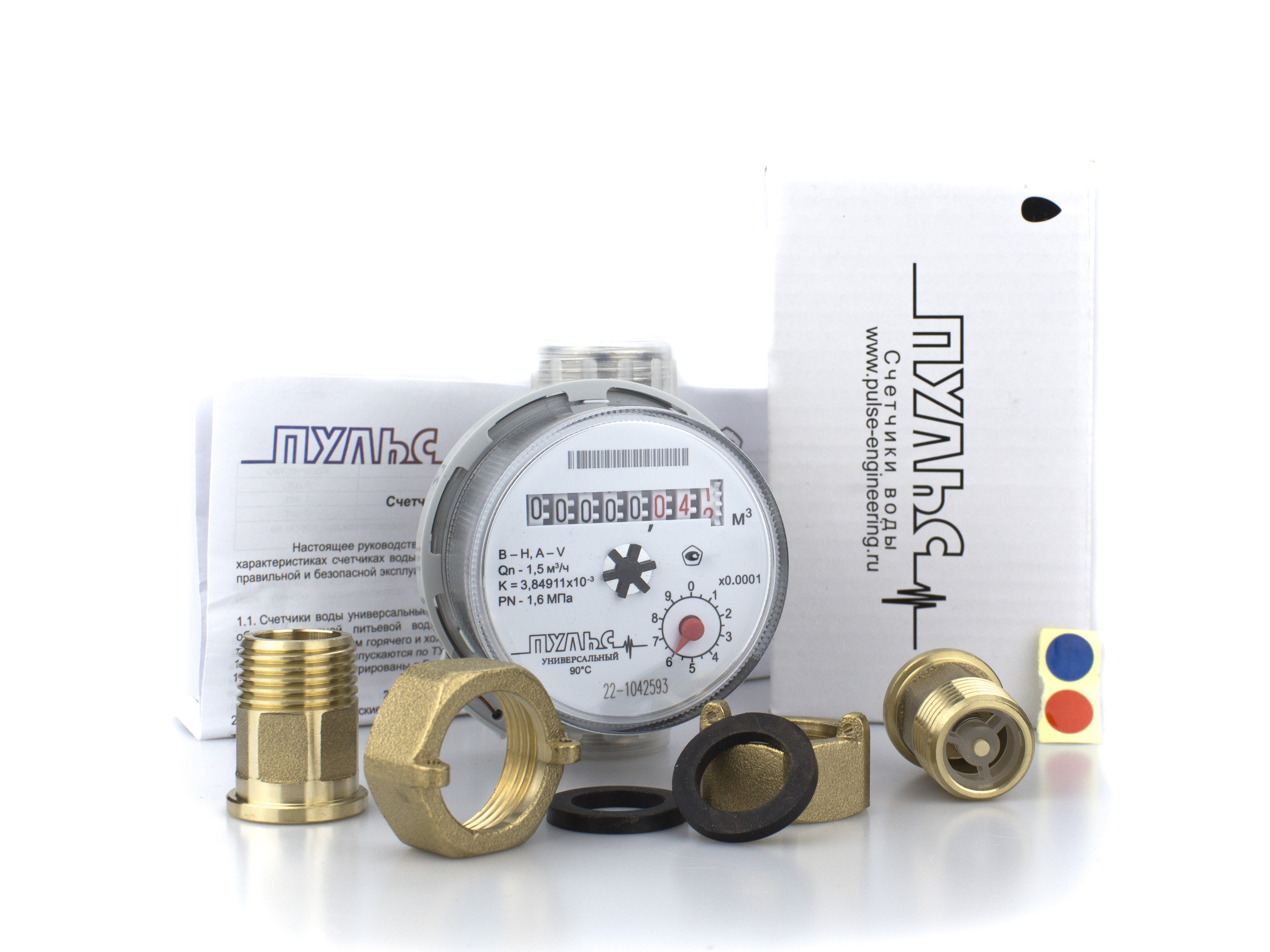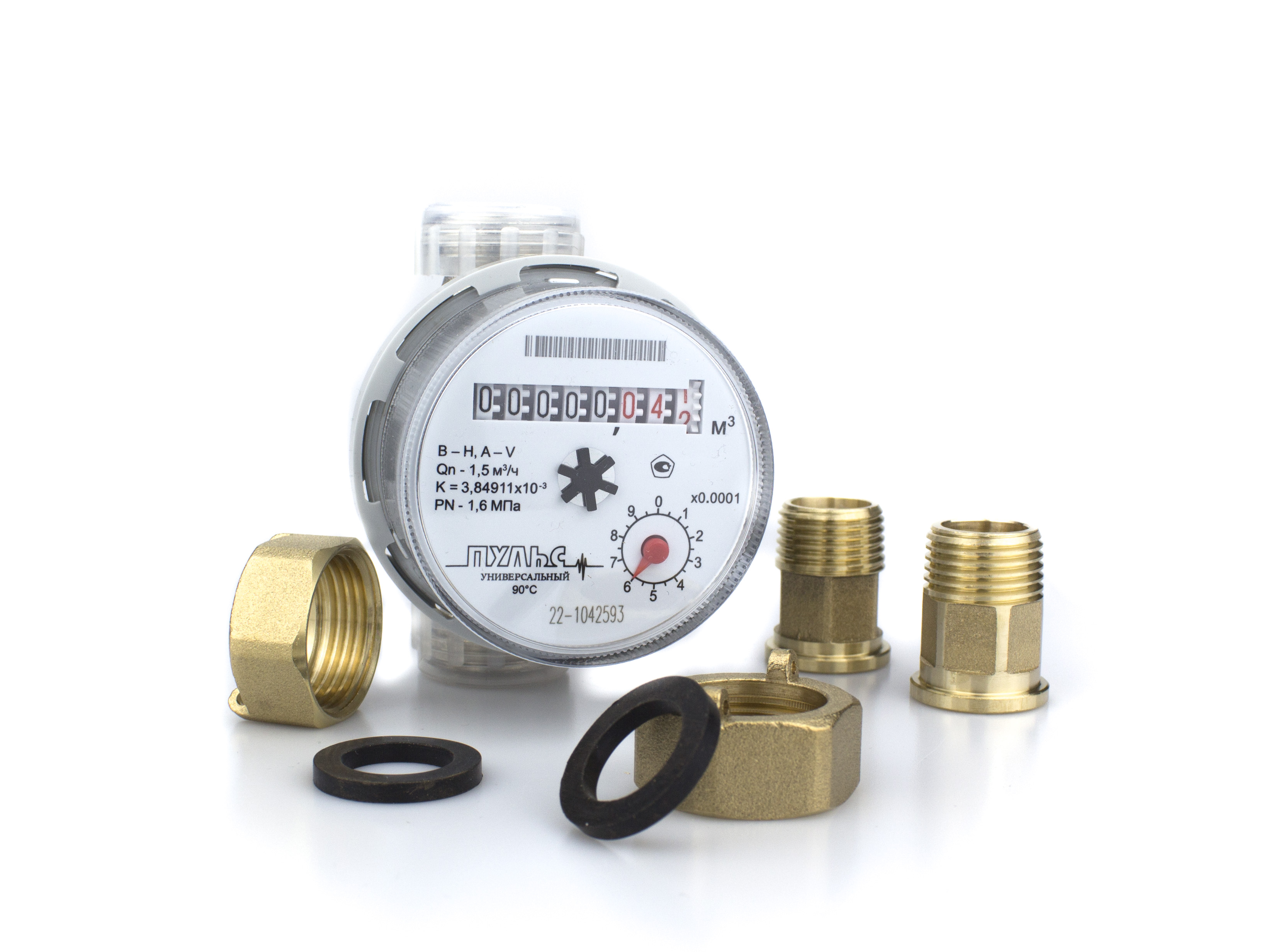 Комплект из счетчика воды Пульс 15У-80 и монтажными частями, состоящими из двух резьбовых штуцеров - один выход с внутренней резьбой 3/4" (20 мм) и один выход с наружной резьбой 1/2" (15 мм), двух гаек и двух прокладок.