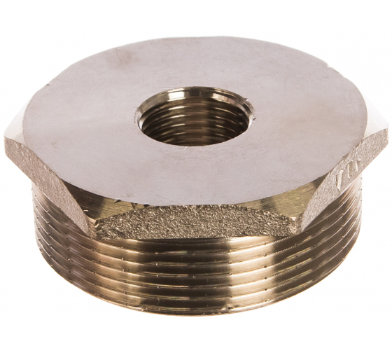 (VTr.581.N) Футорка – фитинг, обеспечивающий соединение труб разного типоразмера, подключение трубопровода к элементу системы с большим диаметром присоединительного патрубка, ремонт (замену) поврежденной резьбы. Изделие выполнено из латуни марки CW617N, никелировано. Резьба – наружная/внутренняя, по типу – трубная цилиндрическая, совместимая с наружной конической (ГОСТ 6211). Шестигранная головка футорки служит ее вкручиванию гаечным ключом.