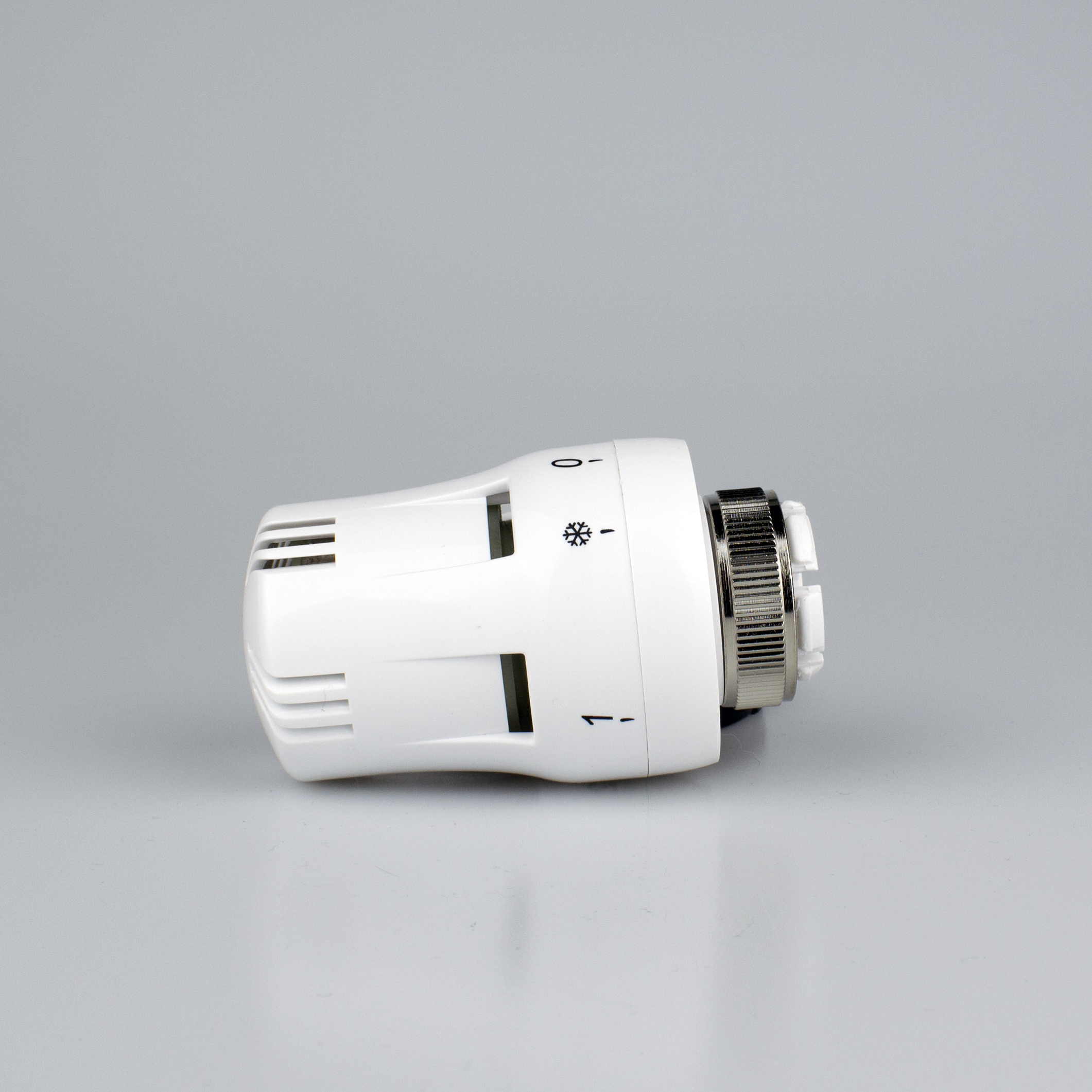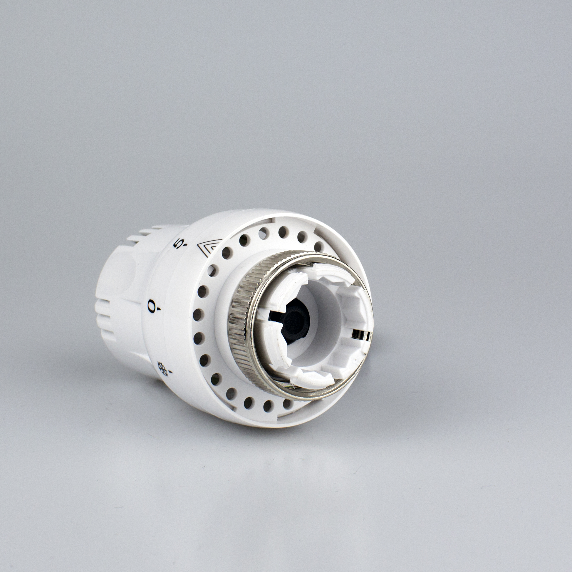 Термостатическая головка состоит из сильфона с термочувствительной жидкостью, пластиковой настроечной рукоятки, возвратной пружины, присоединительной гайки.