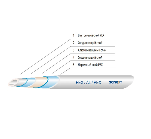 Трубы SANEXT «Стабил» состоят из основного внутреннего слоя сшитого полиэтилена натурального цвета (прозрачный), слоя алюминия, и наружного слоя сшитого полиэтилена белого цвета. Между слоев располагается соединяющий полимерный слой.