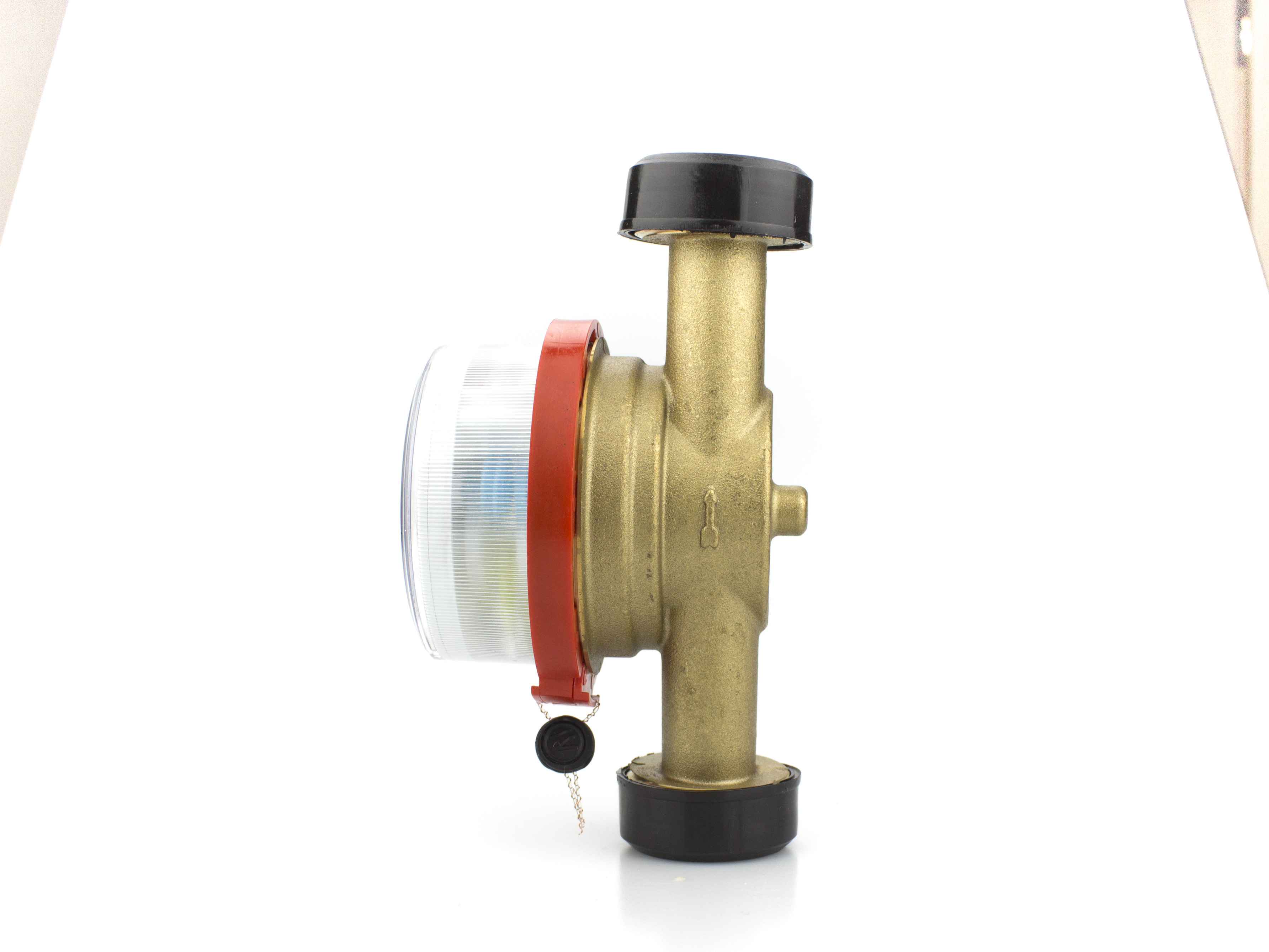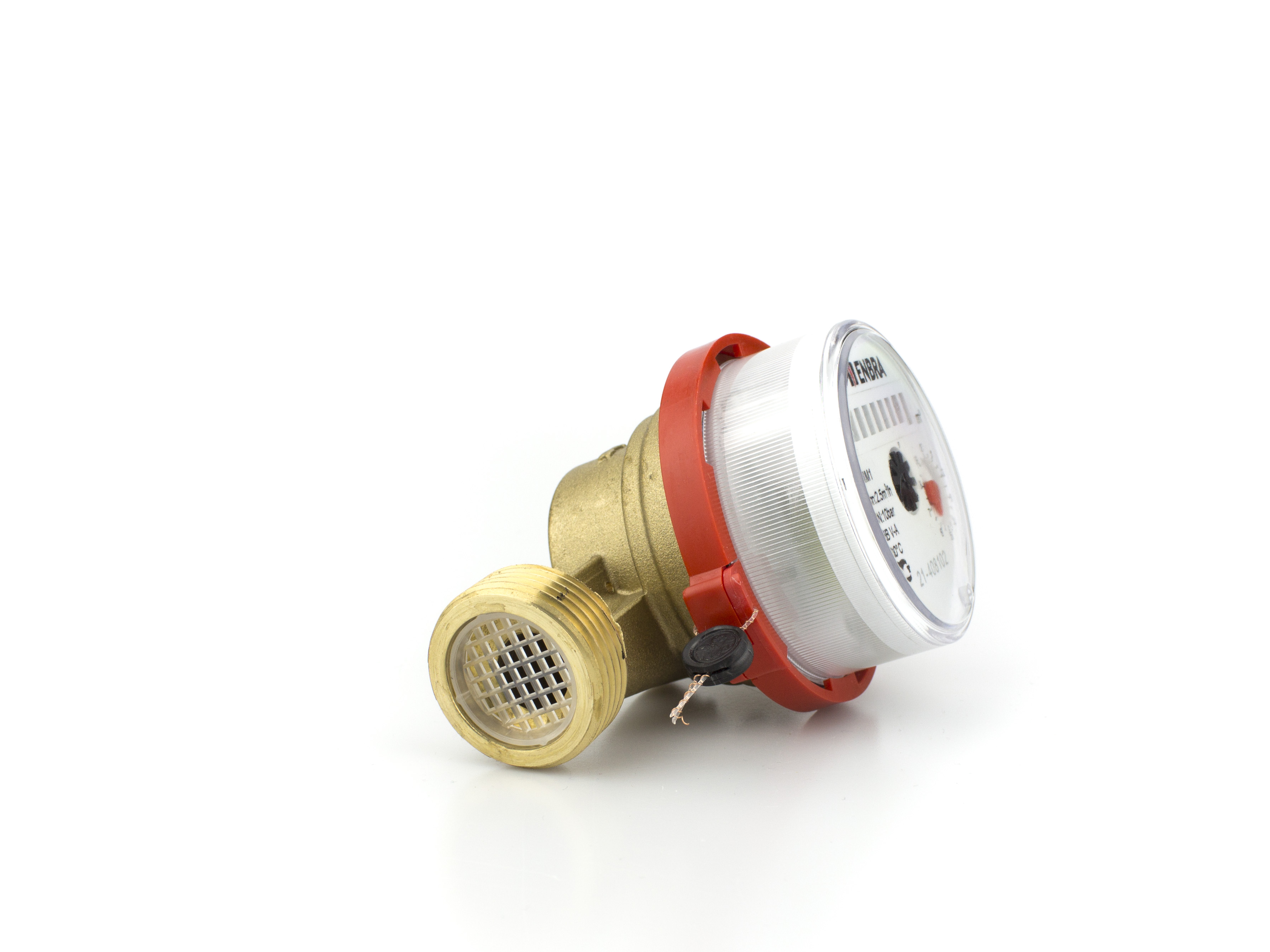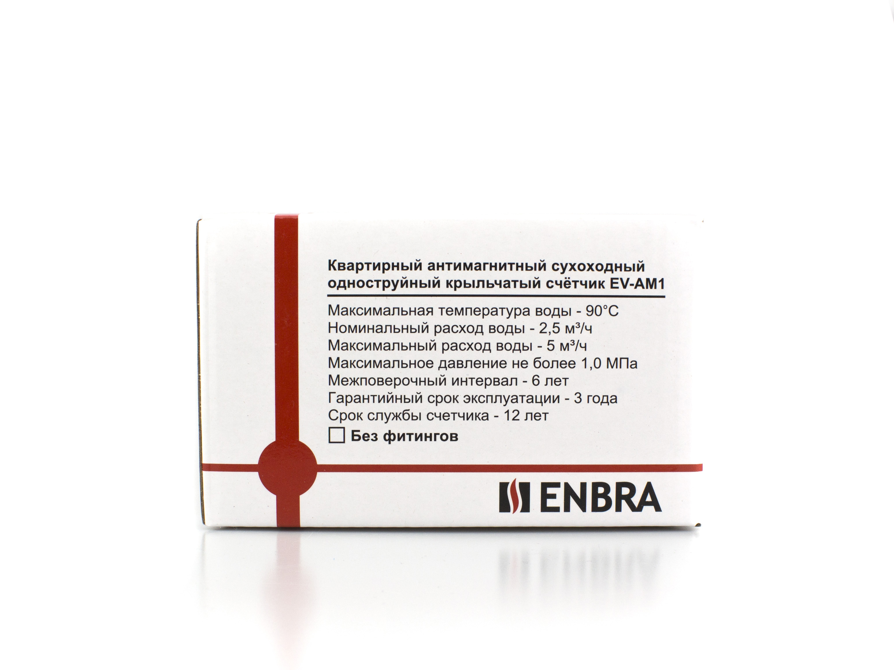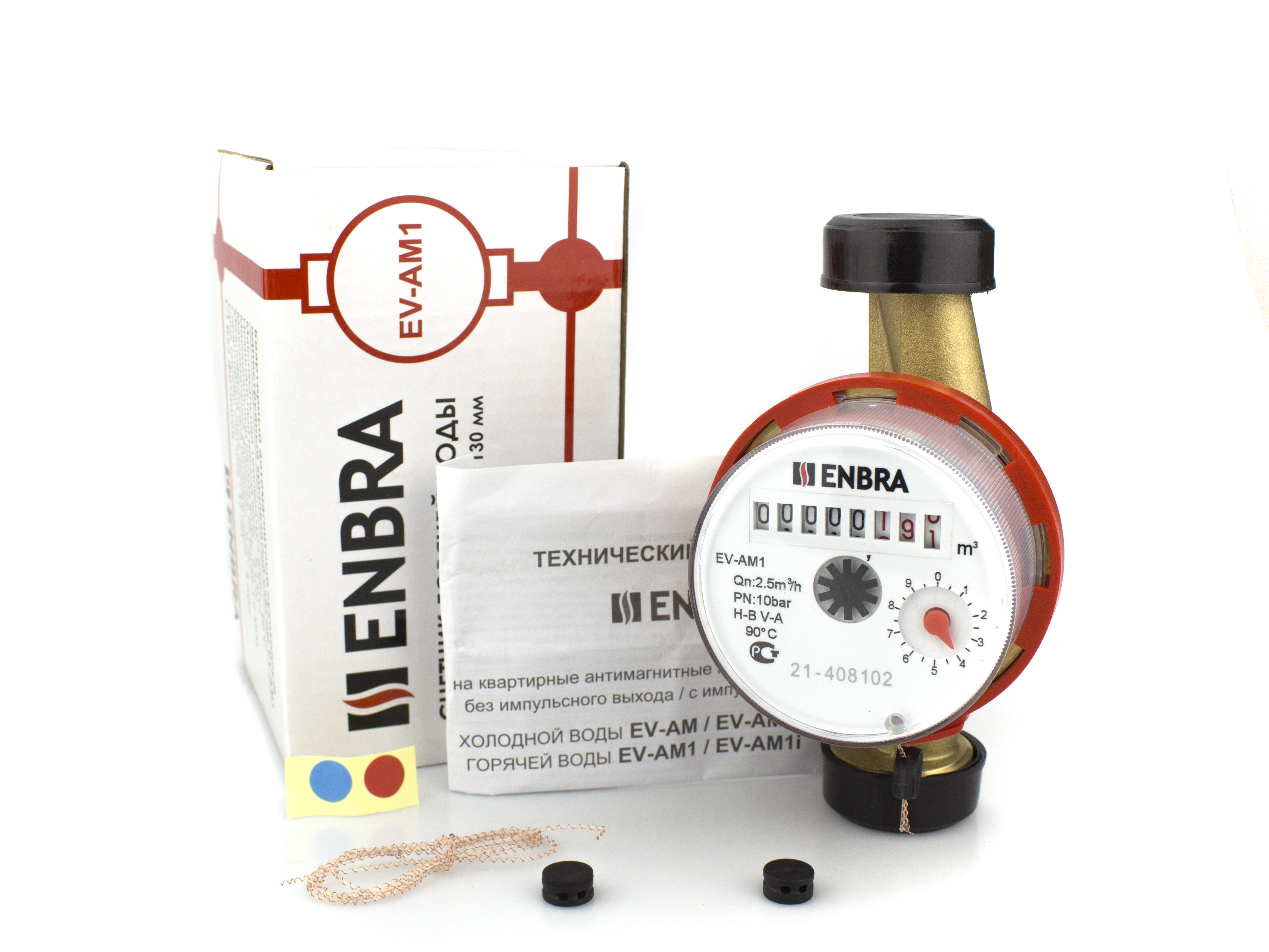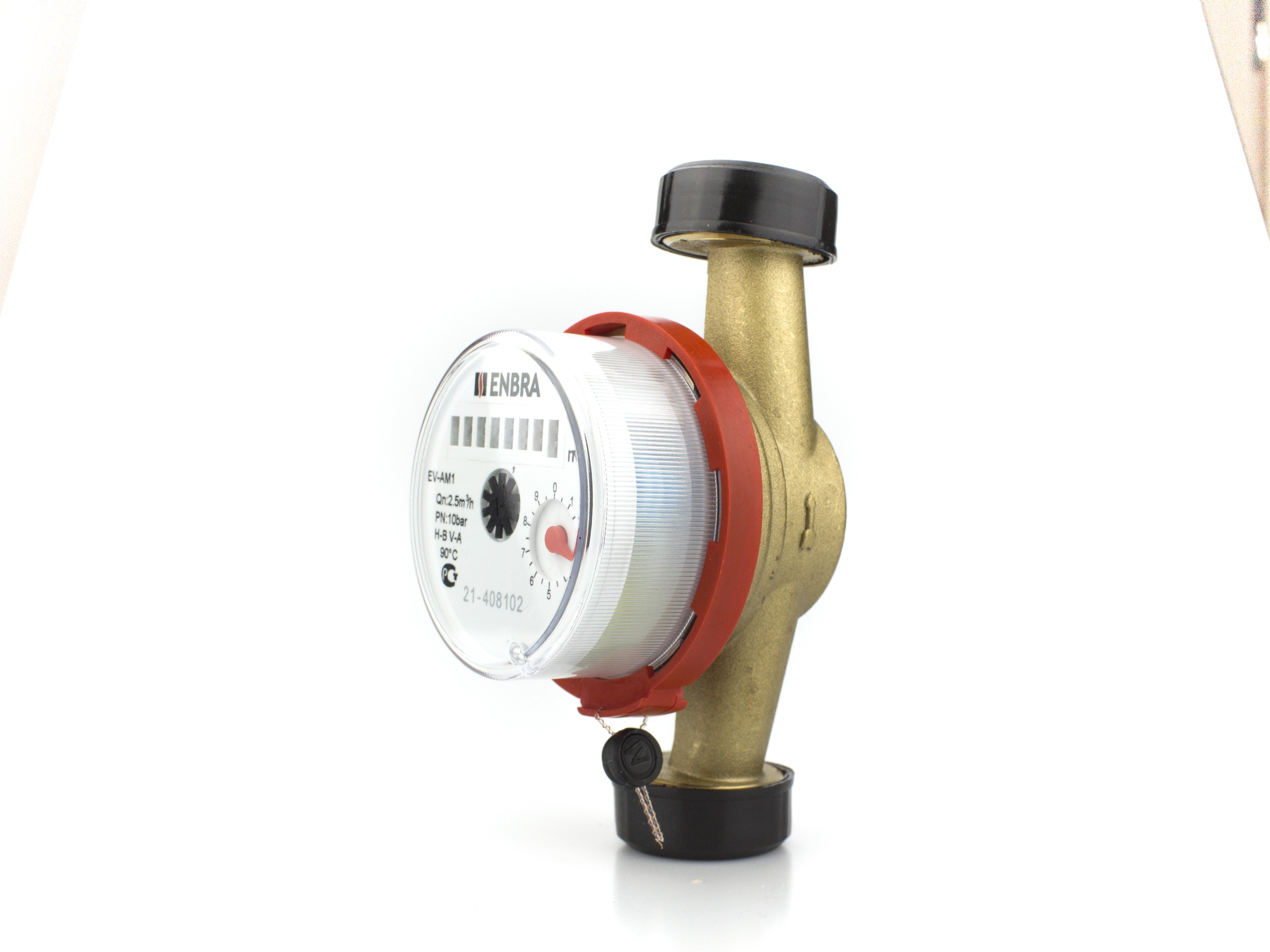 Диаметр условного прохода: Ду 20 с номинальным расходом qp 2,5 м3/ч. Состоит счетчик из проточной части, в полости которой находится крыльчатка, и отсчетного устройства, редукторный механизм которого связан с крыльчаткой через магнитную муфту. Для определения объема воды (м3) масштабирующий редуктор счетного механизма имеет восемь барабанчиков. Корпус счетчика изготовлен из латуни, а крыльчатка и отсчетное устройство из пластмассы. Вращающийся счётный механизм имеет вакуумное уплотнение и двух подшипниковую посадку в сапфировых гнёздах, которые гарантирую стабильность получаемых метрологических характеристик и долговечность счетчика. А удобная шкала считывания, допускает горизонтальную или вертикальную установку прибора. Счетчик воды EV-AM1 имеют отличную антимагнитную защиту, обеспеченную четырьмя антимагнитными сегментами. Счетчик горячей воды ENBRA внесен в государственный реестр средств измерений России.